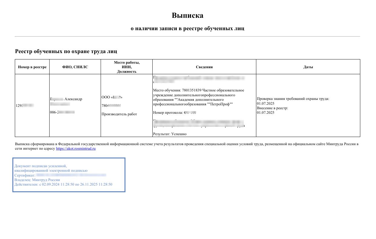 Освоив курс, вы сможете уверенно применять полученные навыки в повседневной работе, что поможет снизить травматизм и избежать производственных аварий. Вы не только повысите уровень знаний, но и получите официальный документ (выписку из учебного протокола), подтверждающий вашу квалификацию и прохождение аттестации по ОТ. По запросу предоставим удостоверение.